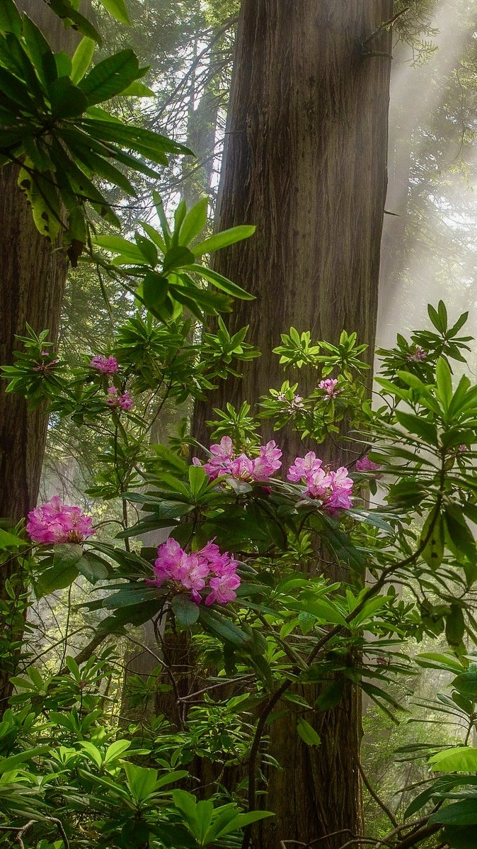 Edytor tapety: Różaneczniki na tle pnia sekwoi