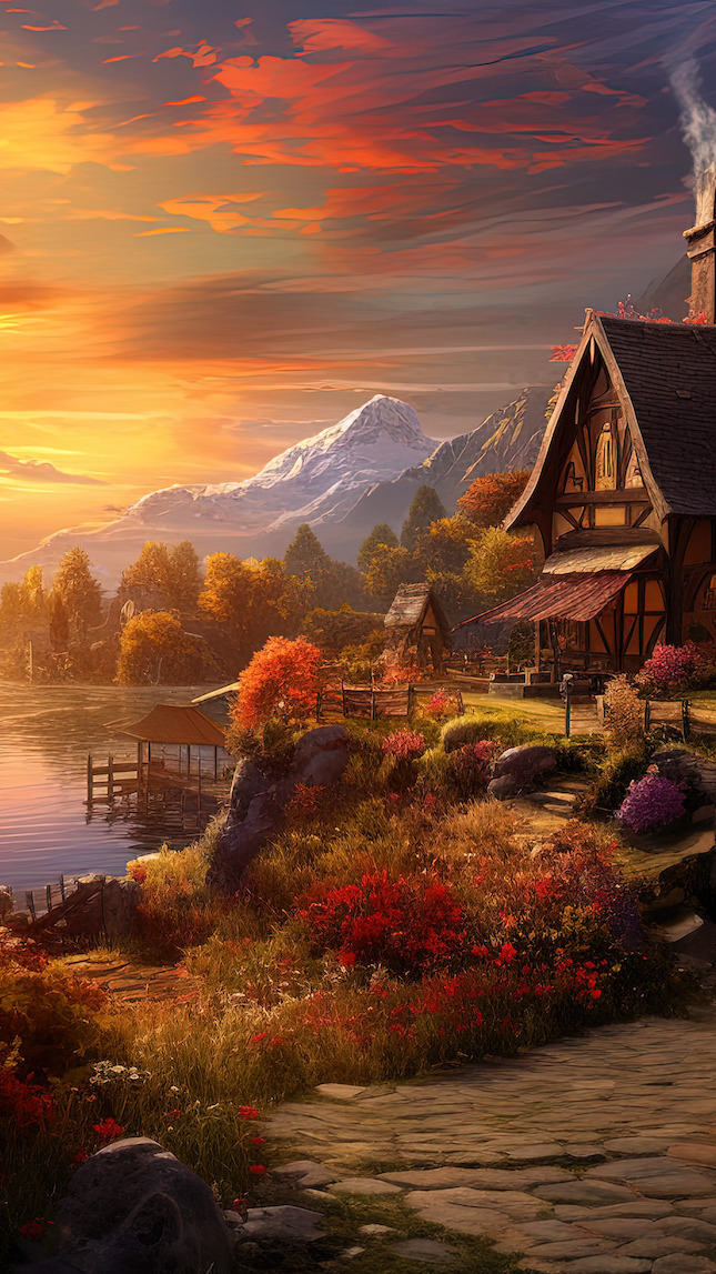 Edytor tapety: Kwiaty przed domem nad jeziorem