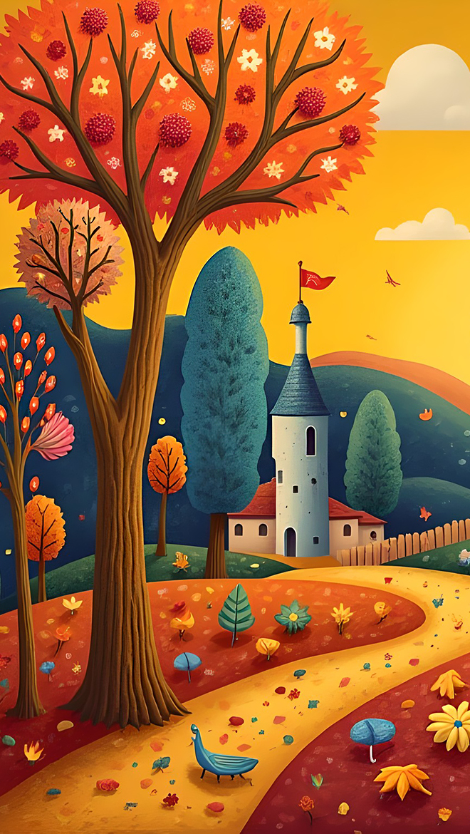 Edytor tapety: Dom i jesienne drzewa w grafice