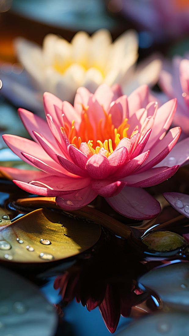 Edytor tapety: Rozświetlona i rozkwitnięta różowa lilia wodna