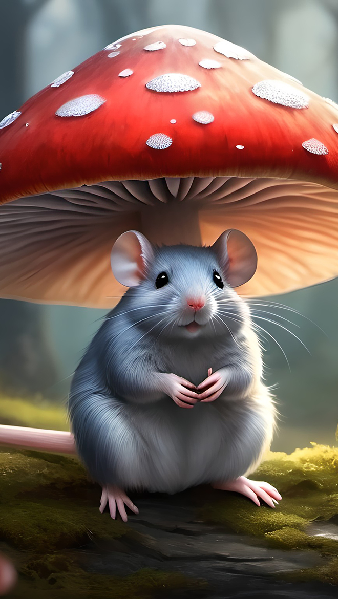 Edytor tapety: Grafika z szarą myszą pod muchomorem