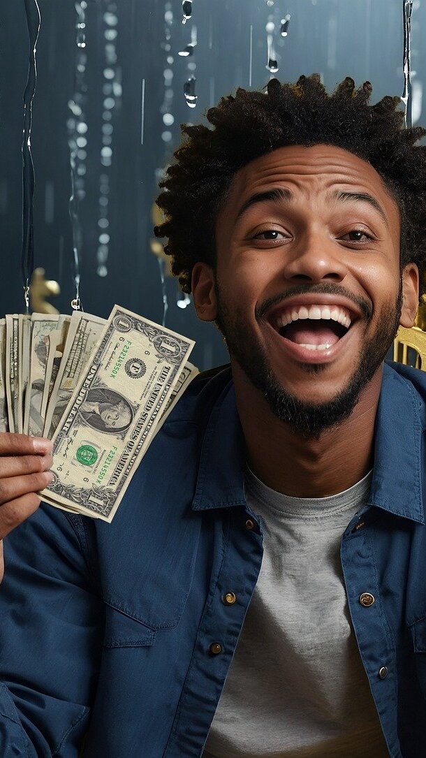 Edytor tapety: Uśmiechnięty mężczyzna z banknotami w dłoni