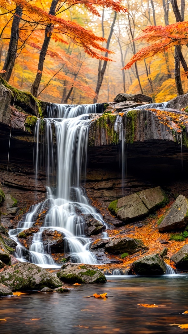 Edytor tapety: Pożółkłe jesienne drzewa przy skalnym wodospadzie