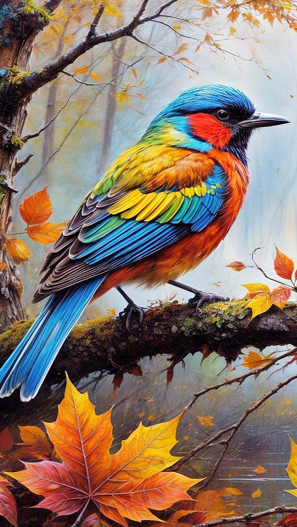 Edytor tapety: Kolorowy ptak stojący na gałązce