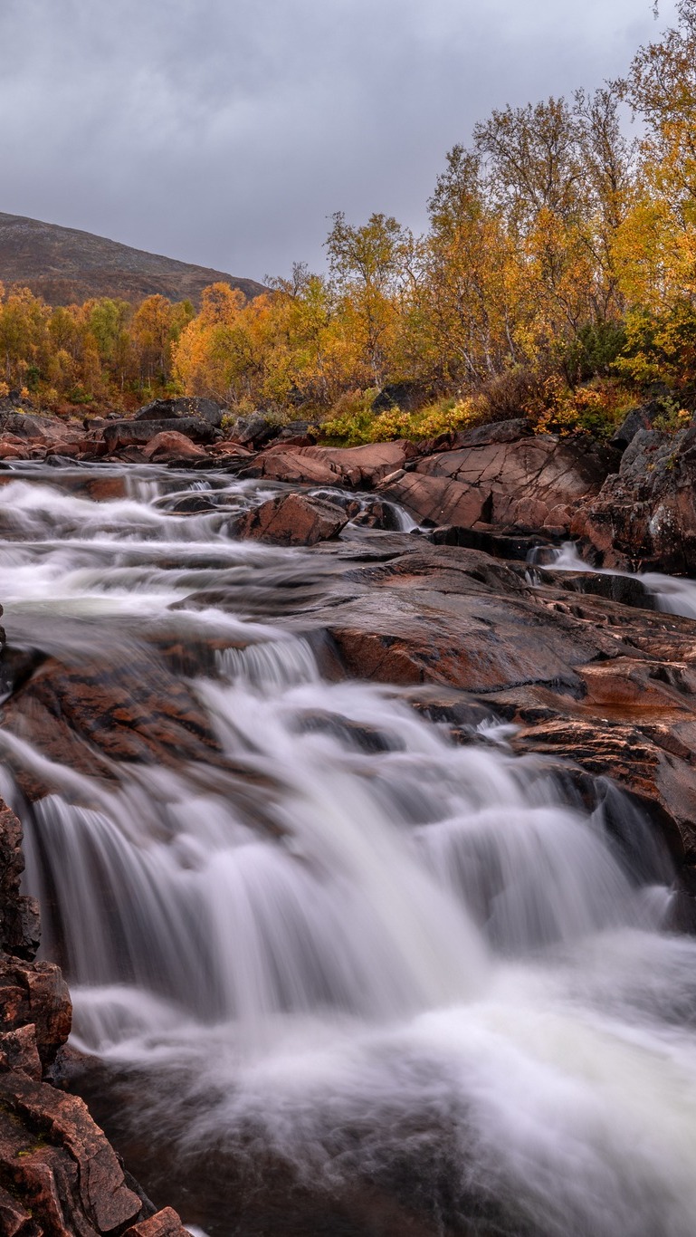 Edytor tapety: Pożółkłe drzewa przy kamienistej rzece