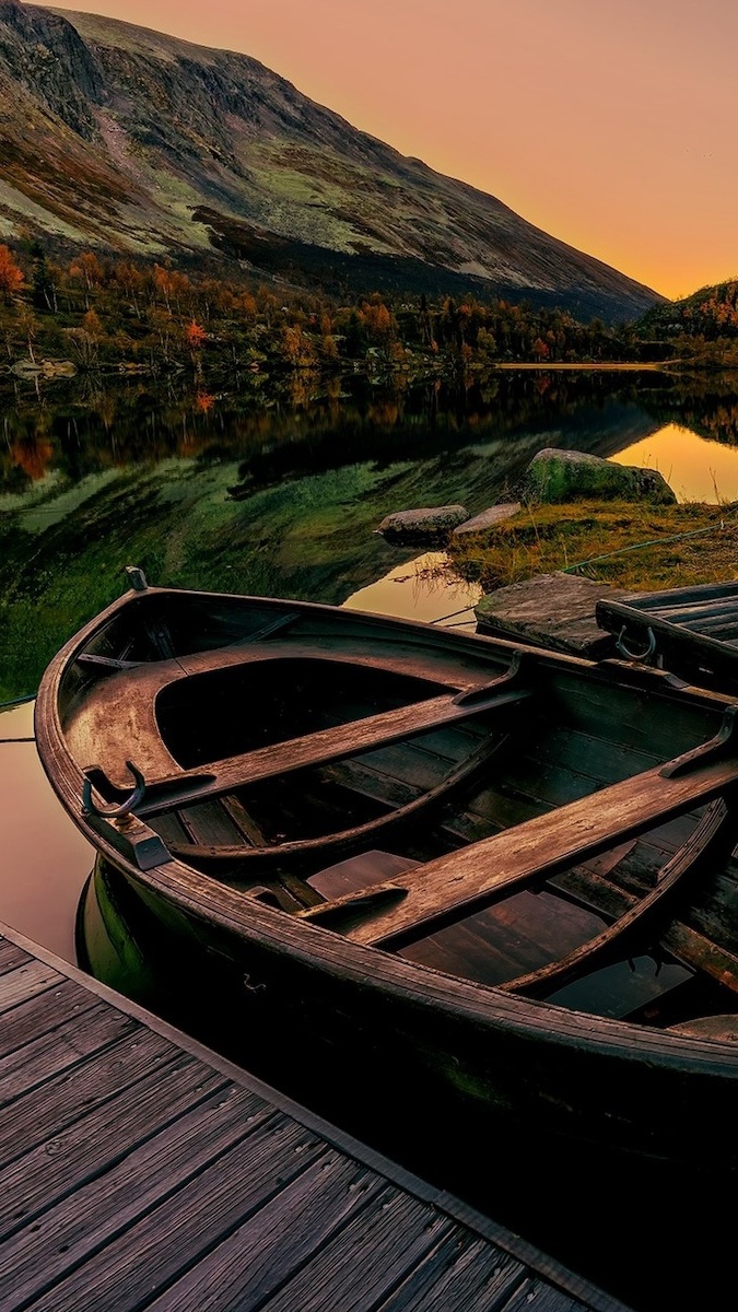 Edytor tapety: Łódka przy pomoście nad górskim jeziorem