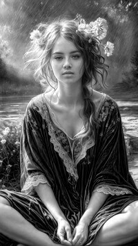 Edytor tapety: Siedząca kobieta w sukience z kwiatami we włosach