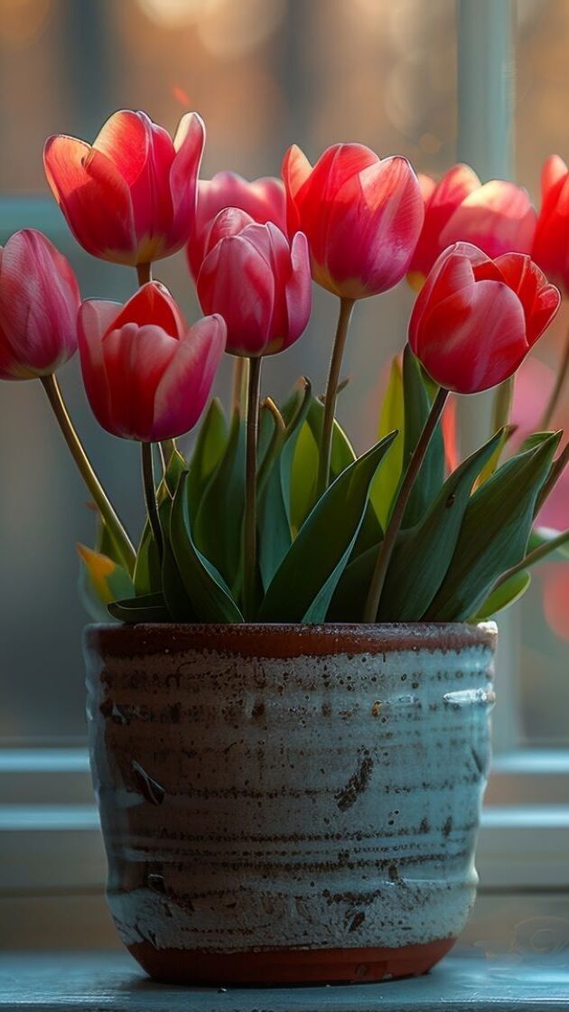 Edytor tapety: Czerwone tulipany w doniczce