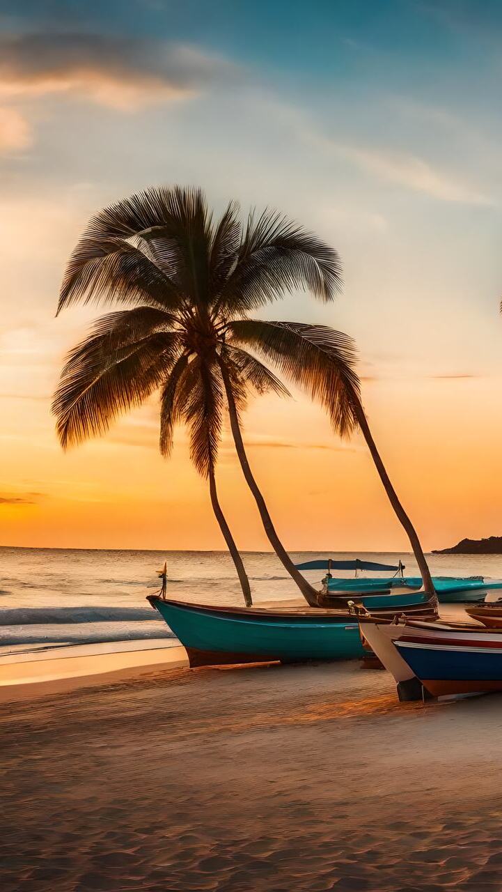 Edytor tapety: Palmy i łódki na morskiej plaży