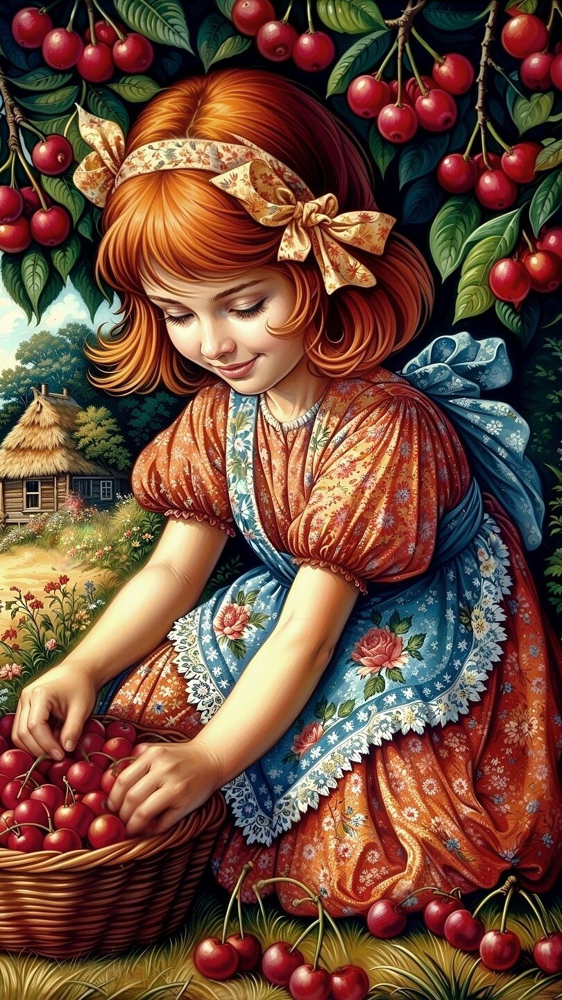 Edytor tapety: Ruda dziewczynka z koszem wiśni