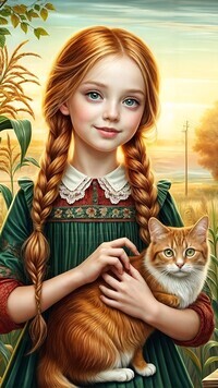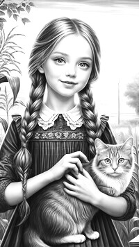 Edytor tapety: Dziewczynka z warkoczami i kotem na ręce w grafice