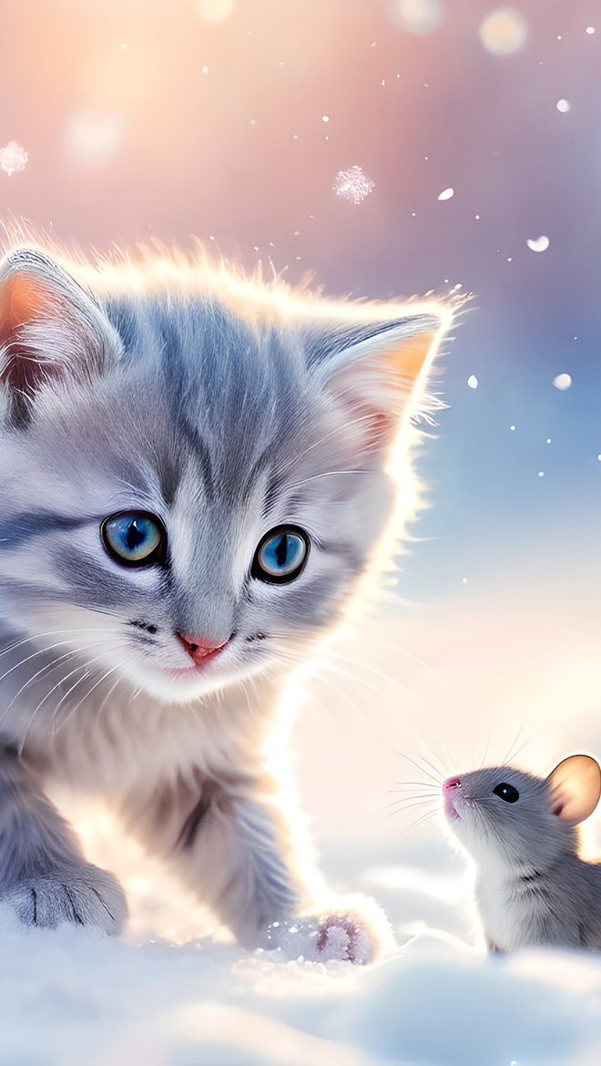 Edytor tapety: Kotek i myszka na śniegu