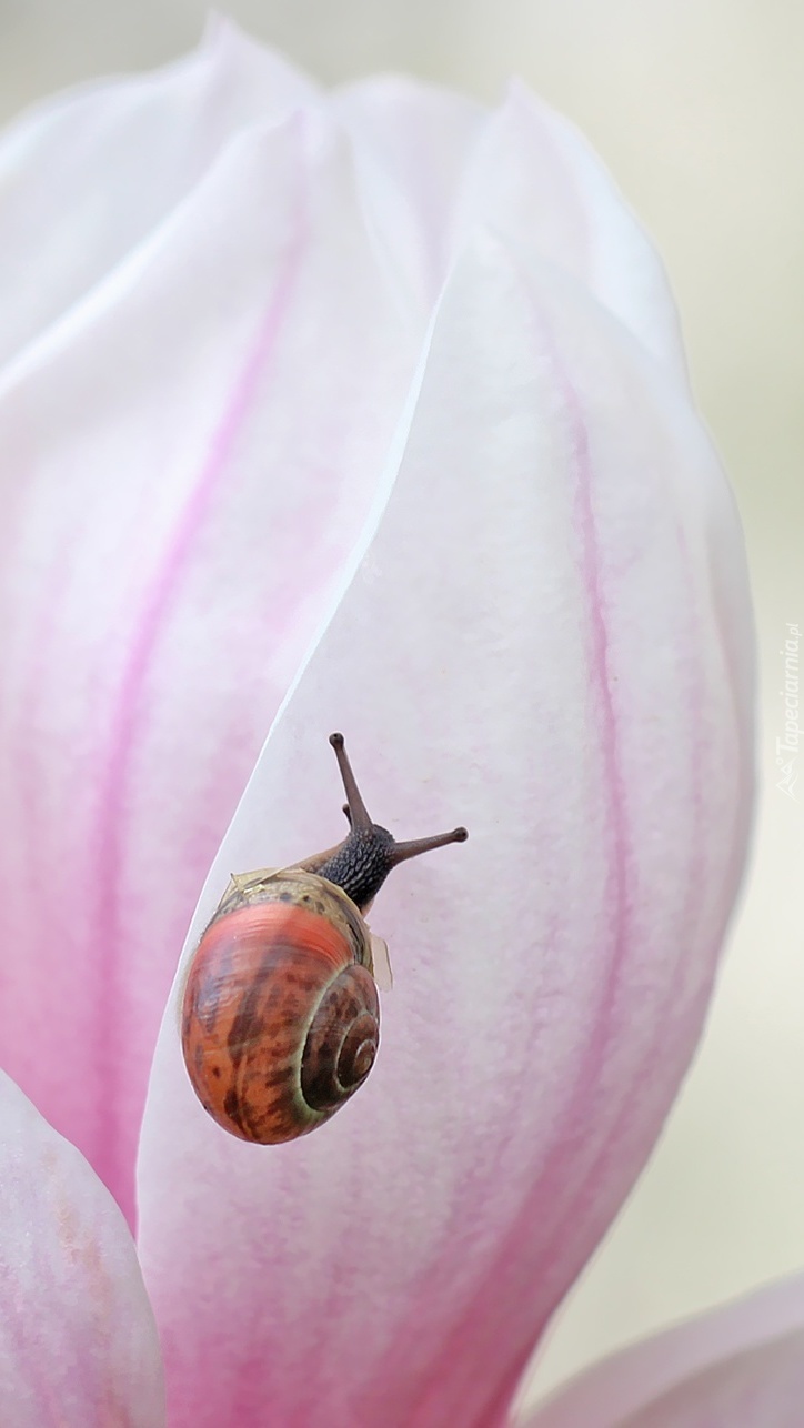 Edytor tapety: Spacer ślimaka po płatku magnolii