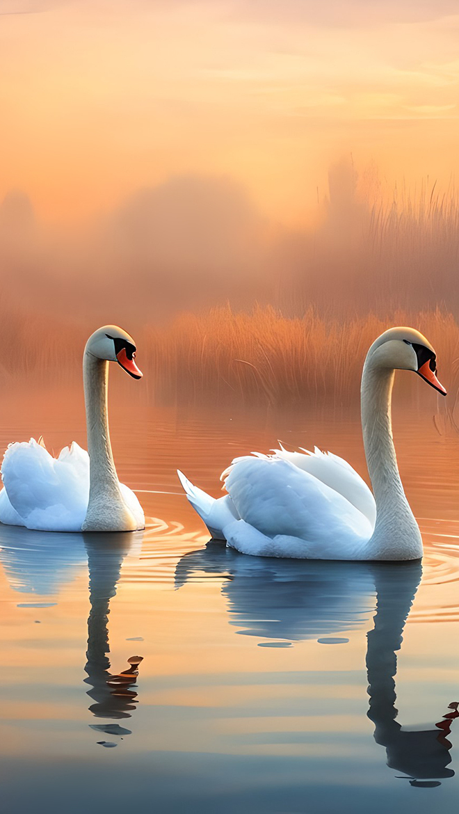 Edytor tapety: Dwa białe łabędzie na zamglonym jeziorze
