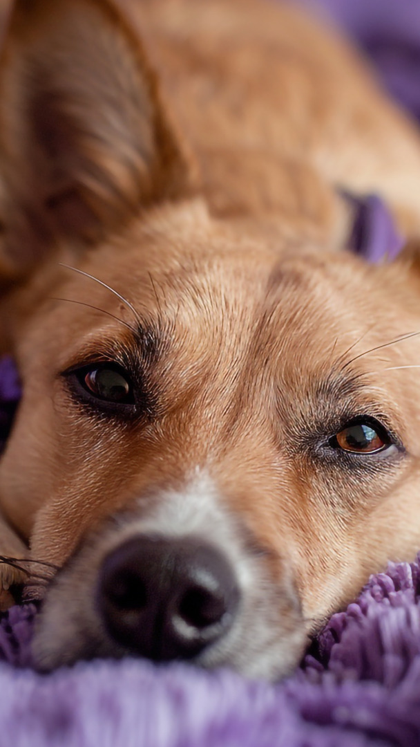 Edytor tapety: Mordka leżącego psa na fioletowym kocu