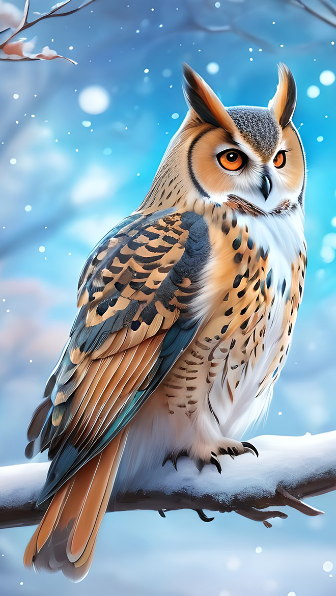 Edytor tapety: Sowa na ośnieżonej gałęzi w grafice