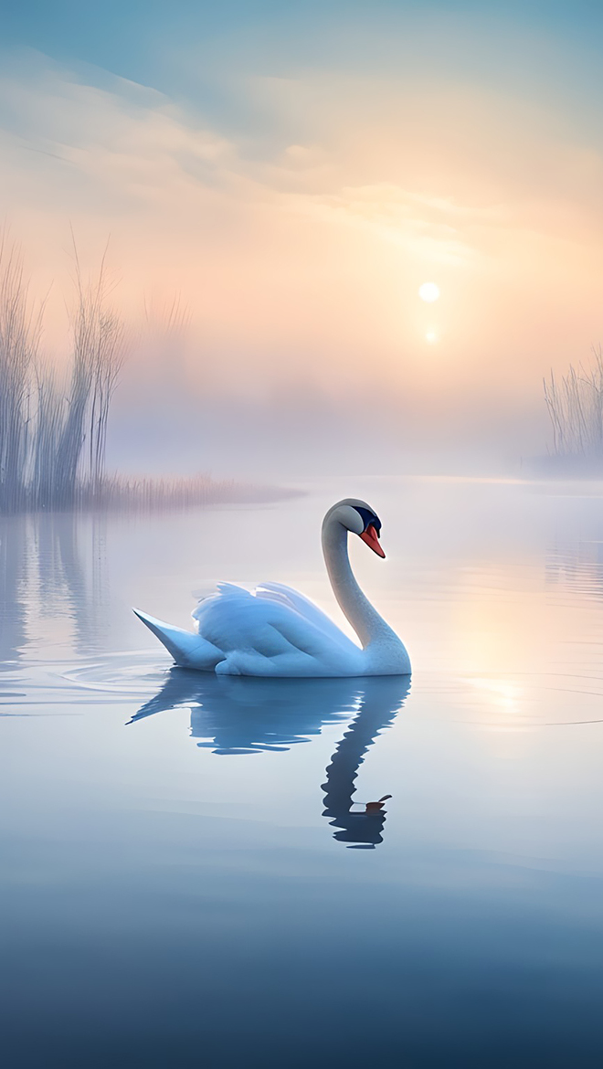 Edytor tapety: Łabędź na zamglonym jeziorze w grafice