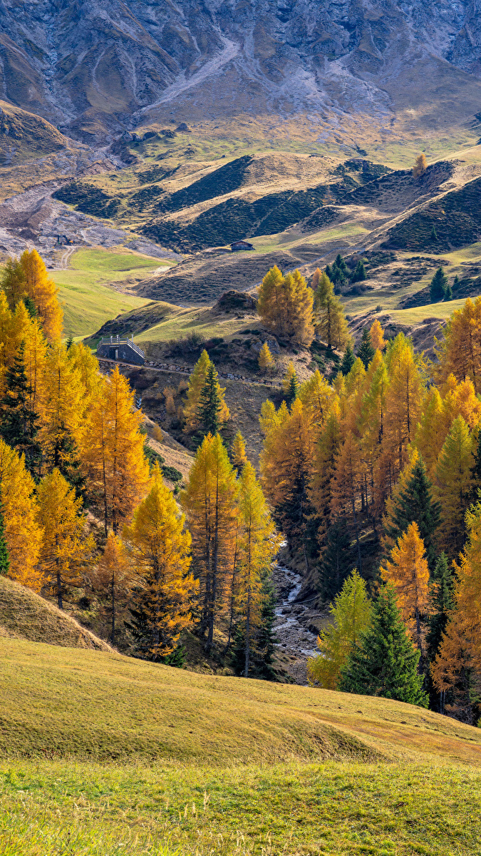 Edytor tapety: Pożółkłe drzewa na tle wzgórz