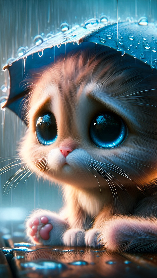 Edytor tapety: Kotek pod parasolem w padającym deszczu