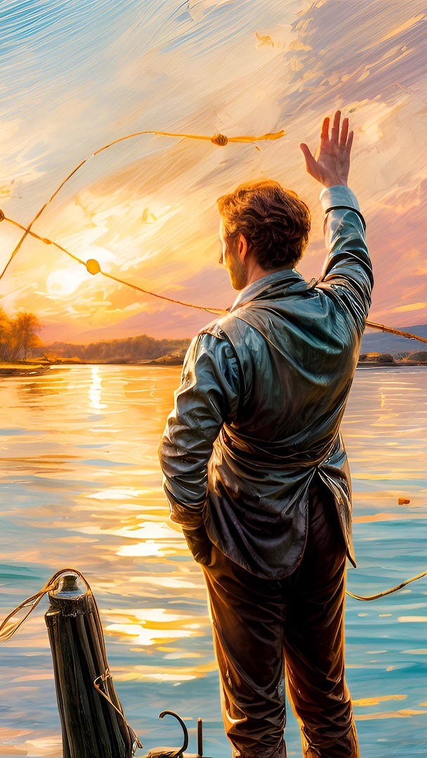 Edytor tapety: Mężczyzna z uniesioną ręką nad jeziorem