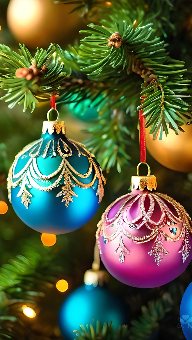 Edytor tapety: Kolorowe bombki na gałązkach choinki