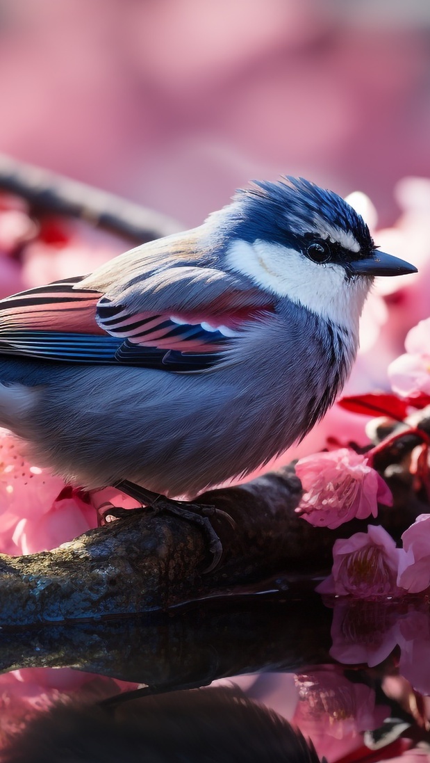 Edytor tapety: Ptak i różowe kwiaty na konarze