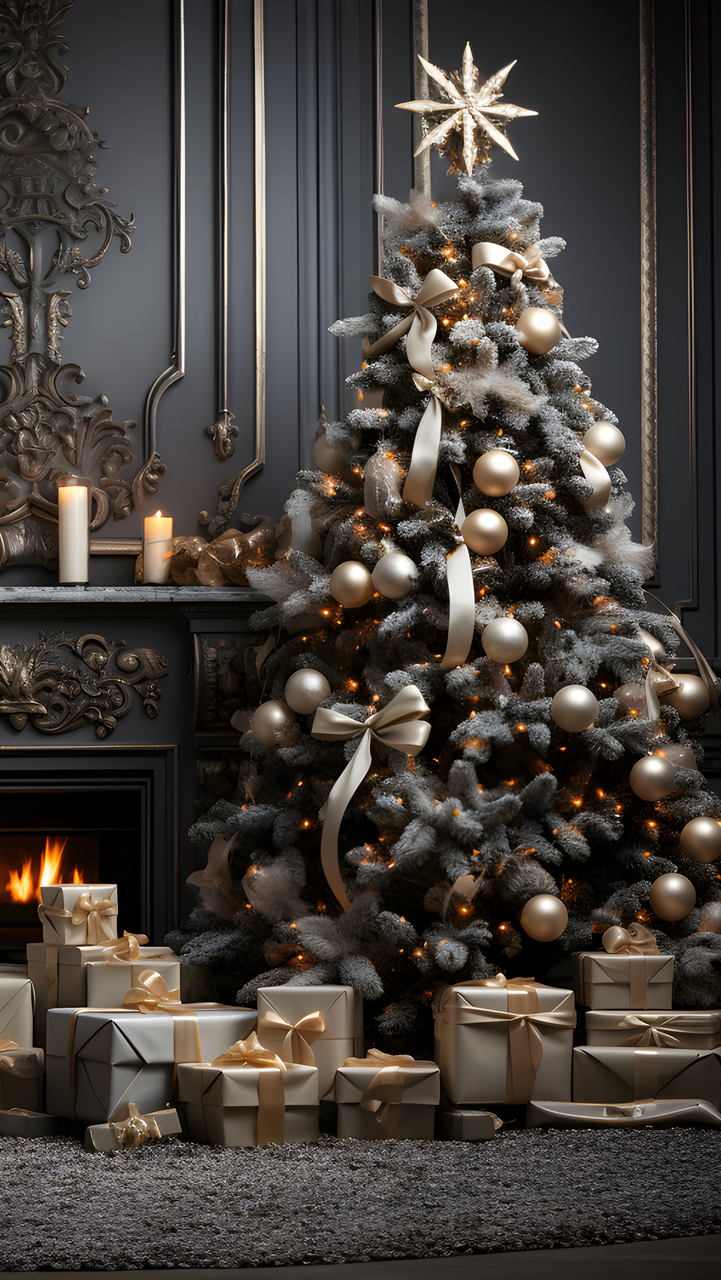 Edytor tapety: Prezenty obok udekorowanej choinki przy kominku
