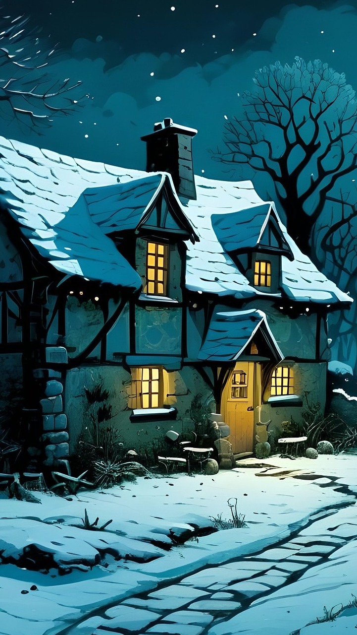 Edytor tapety: Rozświetlony nocą ośnieżony dom