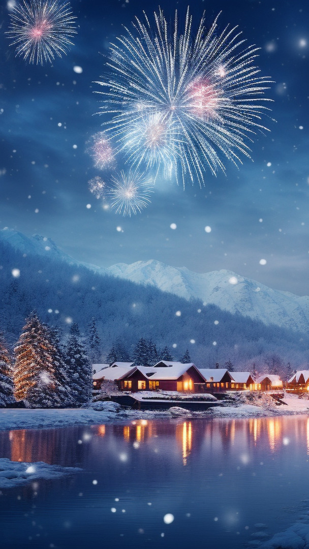 Edytor tapety: Fajerwerki nad ośnieżonymi domami przy rzece