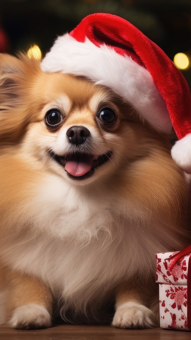 Edytor tapety: Chihuahua w czapce Mikołaja obok prezentu