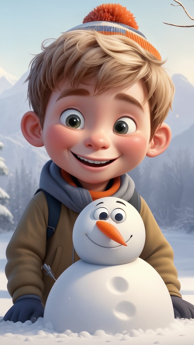 Edytor tapety: Uśmiechnięty chłopiec obok małego bałwana