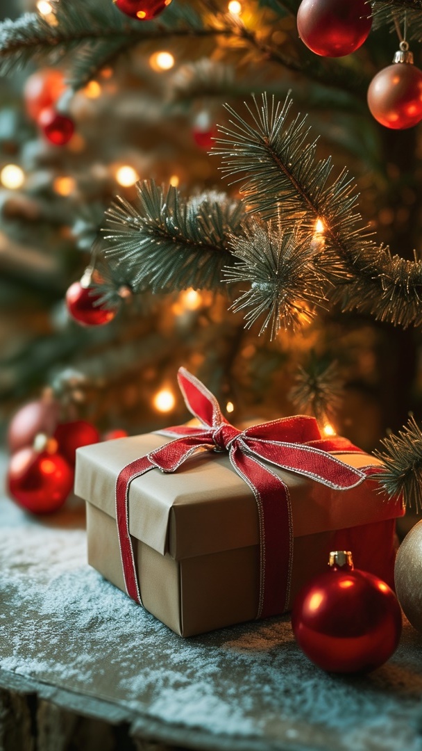 Edytor tapety: Prezent leżący pod udekorowaną choinką