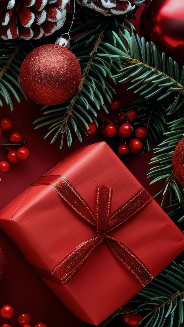 Edytor tapety: Czerwony prezent i bombki przy gałązkach