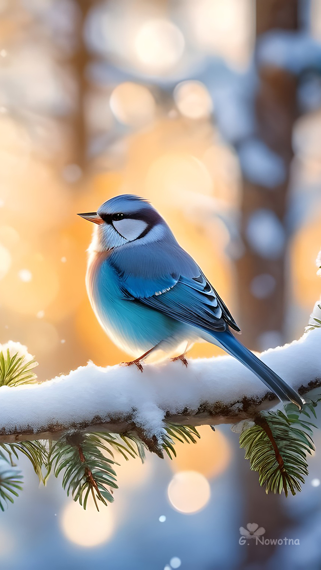Edytor tapety: Ptak na ośnieżonej świerkowej gałązce