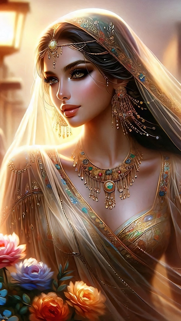 Edytor tapety: Ciemnowłosa kobieta w welonie i biżuterii
