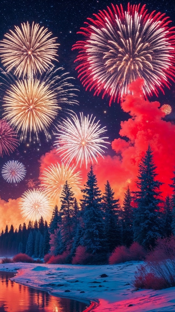 Edytor tapety: Fajerwerki nad lasem i rzeką