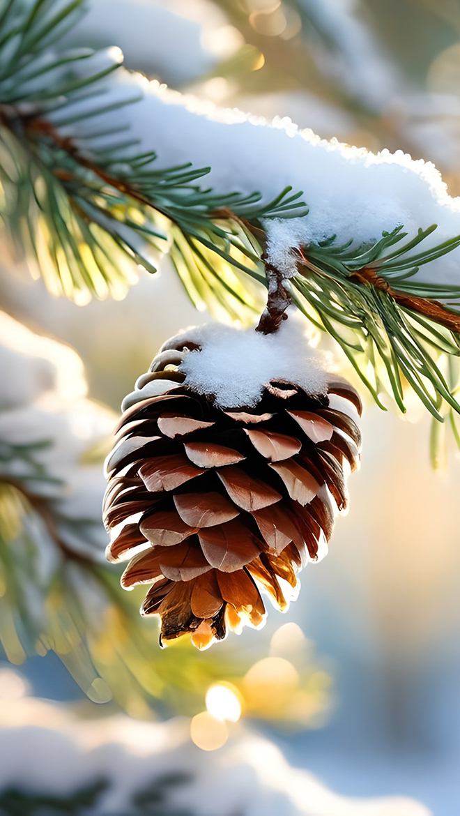 Edytor tapety: Ośnieżona gałązka świerkowa z szyszką