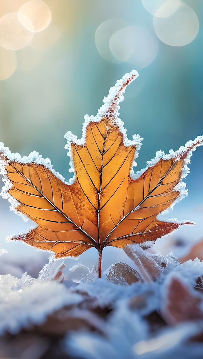 Edytor tapety: Oszroniony jesienny liść w śniegu