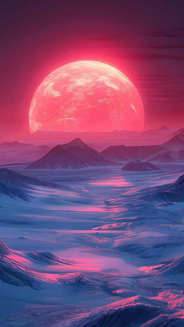 Edytor tapety: Zachód czerwonego słońca nad ośnieżonymi górami