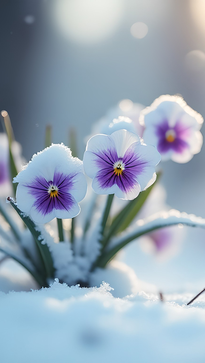 Edytor tapety: Ośnieżone biało-fioletowe bratki w śniegu