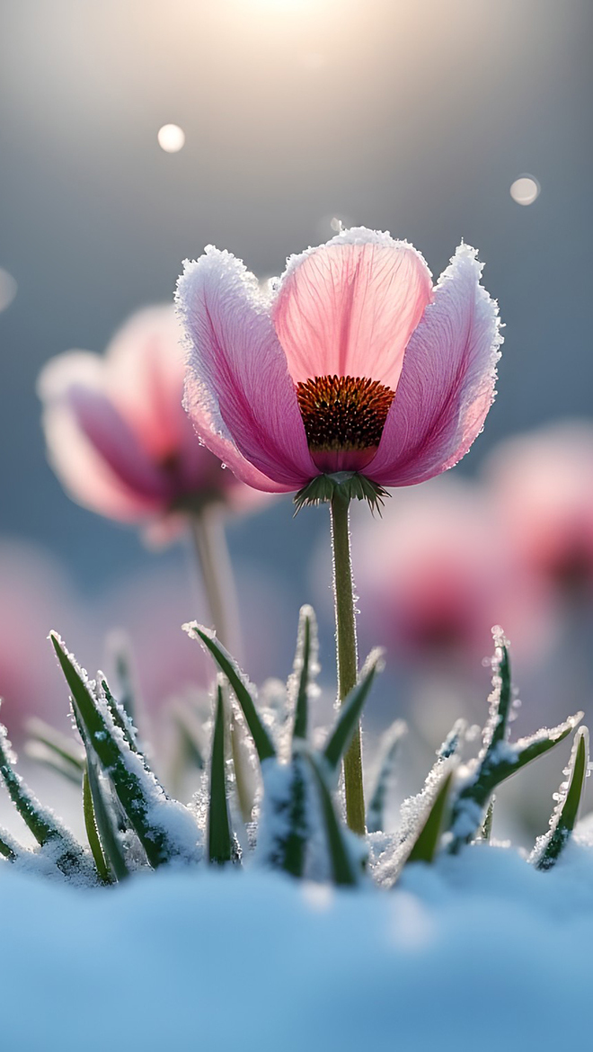 Edytor tapety: Różowe kwiaty w śniegu