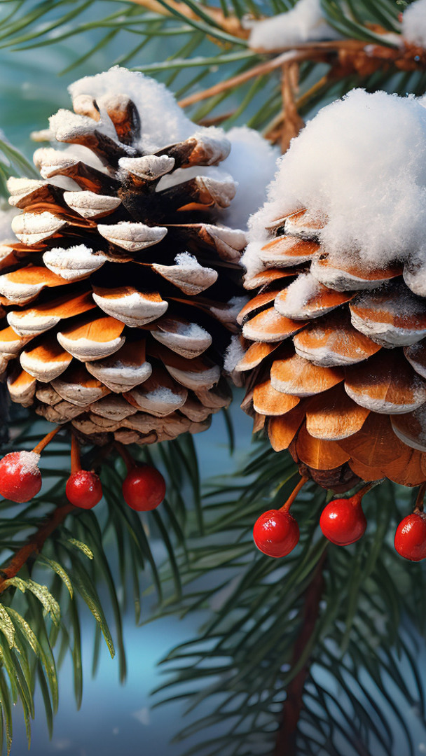 Edytor tapety: Jagody i ośnieżone szyszki na gałązkach