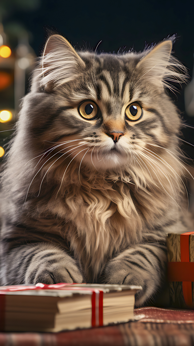Edytor tapety: Puszysty kot obok książki i prezentu