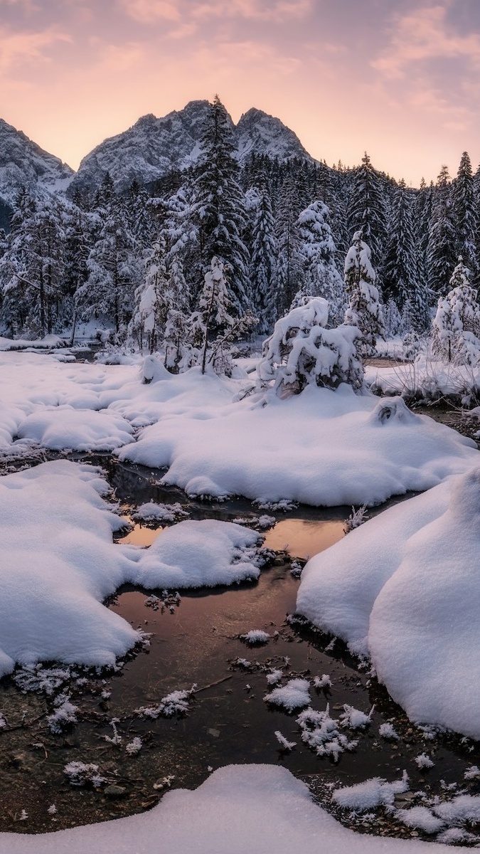 Edytor tapety: Śnieg na jeziorze i ośnieżone góry