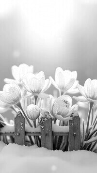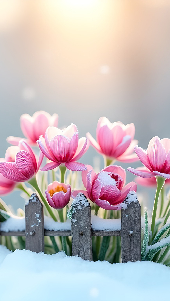 Edytor tapety: Różowe kwiaty i płotek w śniegu