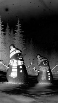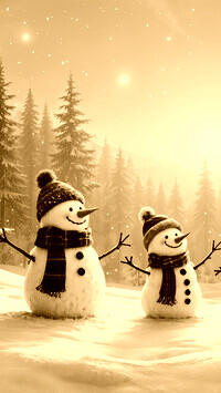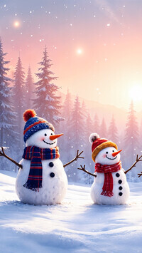 Edytor tapety: Dwa wesołe bałwanki w czapkach i szalikach w słonecznym blasku