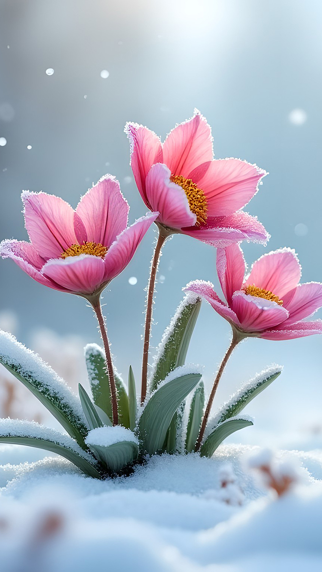Edytor tapety: Ośnieżone trzy różowe kwiaty