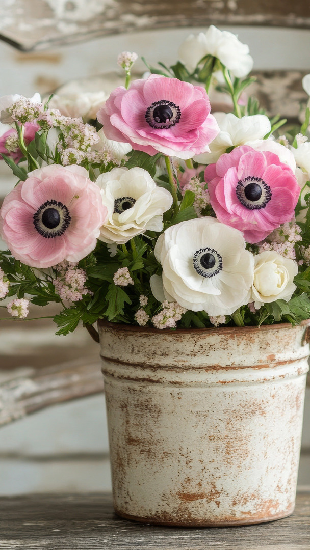 Edytor tapety: Różowe i białe zawilce w wiaderku