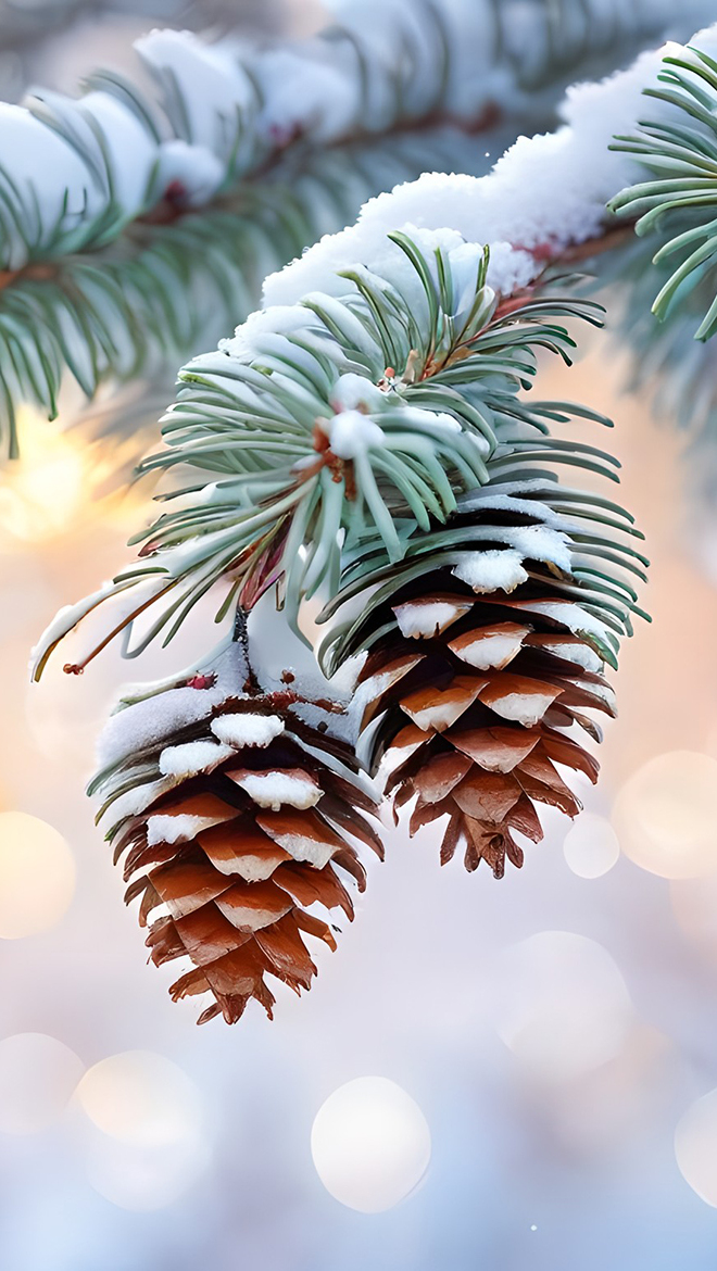 Edytor tapety: Ośnieżone gałązki świerkowe i szyszki