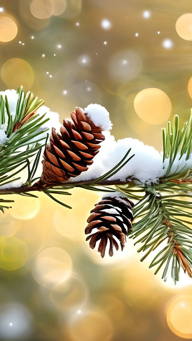 Edytor tapety: Dwie szyszki na ośnieżonej gałązce sosny